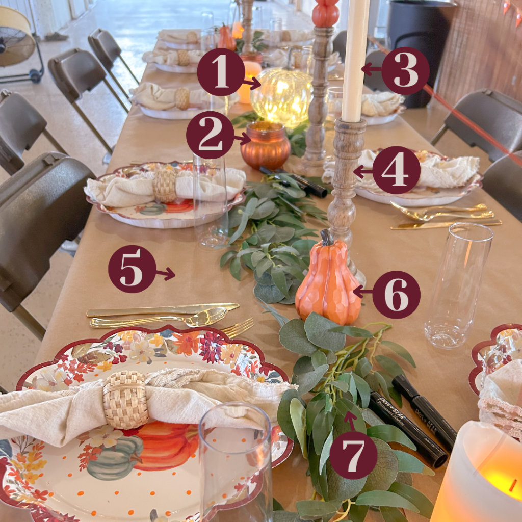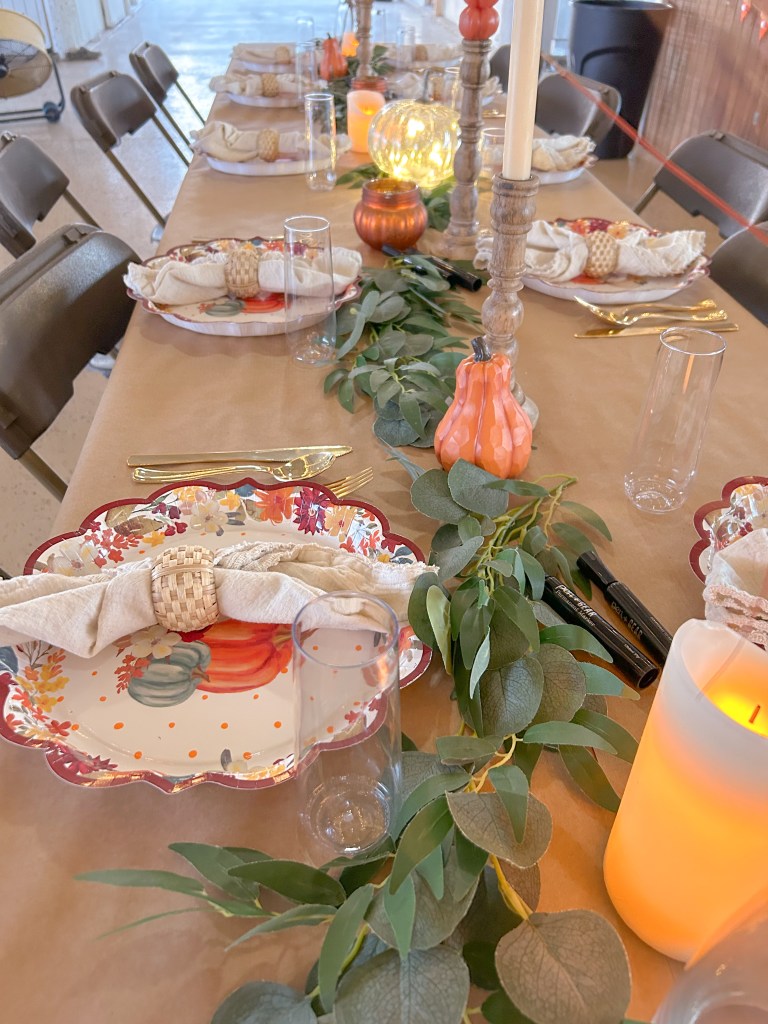 A cohesive table setting starts with a foundation: the tablecloth. For my tablescape, I tried a trend of using brown craft paper. It was so much fun for my friends to doodle, write down what we’re thankful for, and share our favorite memories. It also provides entertainment, especially if you have kids.